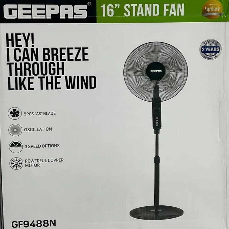 پنکه ایستاده جیپاس مدل GF9488N از محصولات باکیفیت برند GEEPAS است که با بیش از ۳۶ سال سابقه در تولید لوازم خانگی شناخته شده و مورد استقبال قرار گرفته است. این محصول در کشور چین به سفارش امارات متحده ساخته شده است.