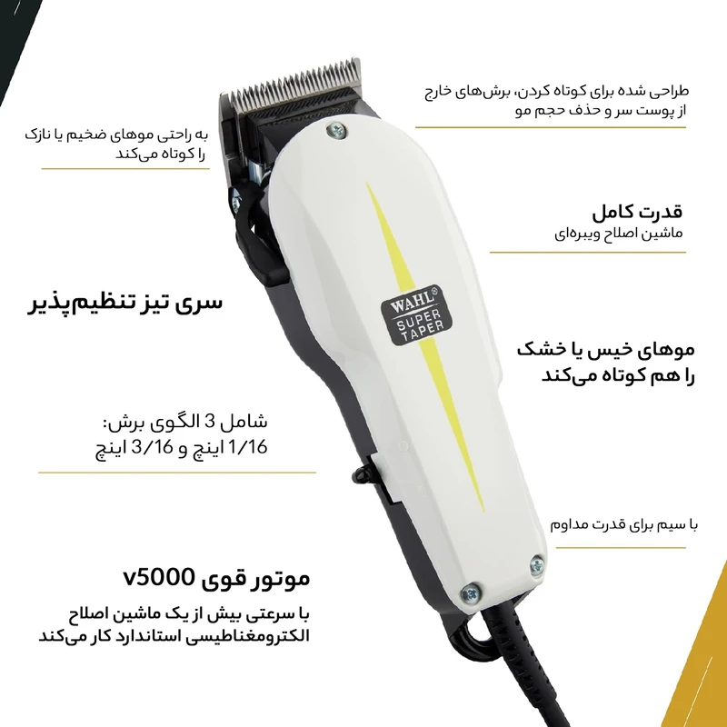 - ماشین اصلاح Super Taper ساخت اروپا بوده و برند Wahl کشور مبدا آن آمریکا است.